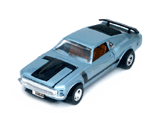 Top left front quarter view of a light blue Gran Toros Mustang Boss 302 with black interior. |