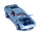 Top left rear quarter view of a brown interior light blue Gran Toros Mustang Boss 302 with open hood, trunk and doors. |