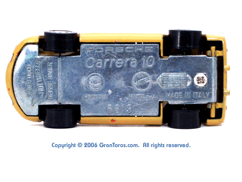 Bottom of an yellow ochre enamel Gran Toros Porsche Carrera 10 showing logos and markings. |