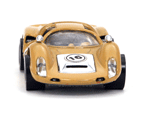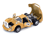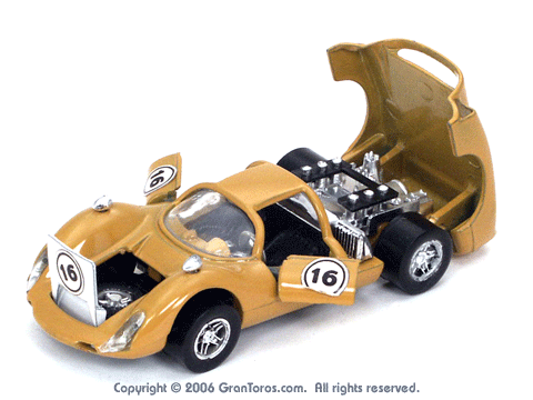 Top left front quarter view of a yellow ochre Gran Toros Porsche Carrera 10 with all doors and compartments open. |