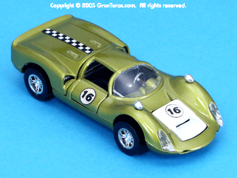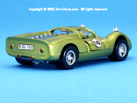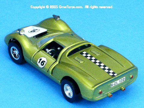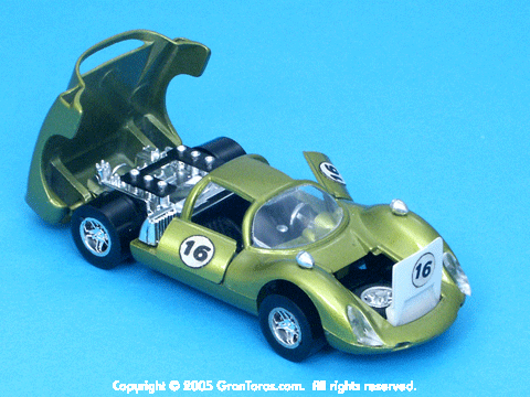 Metallic olive-green Gran Toros Porsche Carrera 10 with all doors and compartments open. |