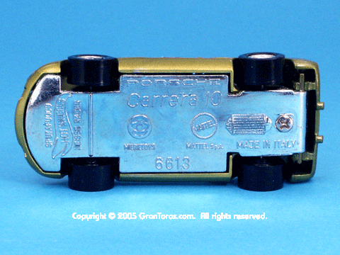 Bottom of a metallic olive-green Gran Toros Porsche Carrera 10 showing logos and markings. |