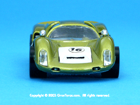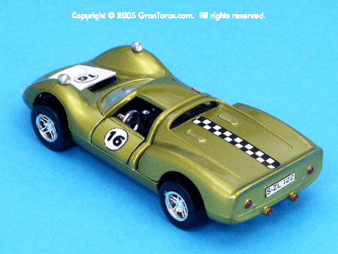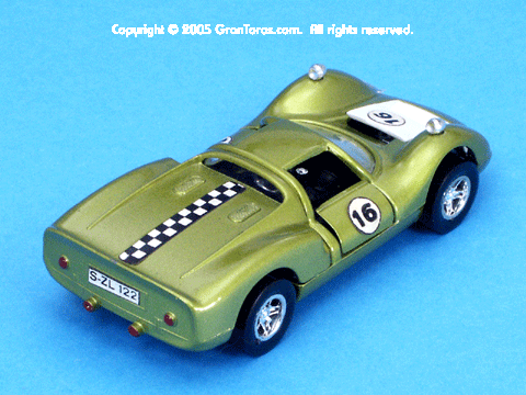 Top right rear quarter view of a metallic olive-green Gran Toros Porsche Carrera 10 (standard mirrors). |