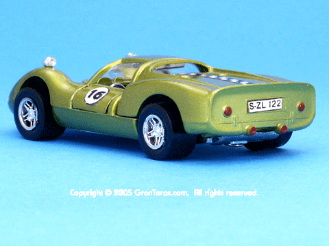 Top left rear quarter view of a metallic olive-green Gran Toros Porsche Carrera 10 (variation mirrors). |