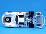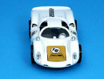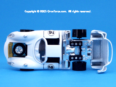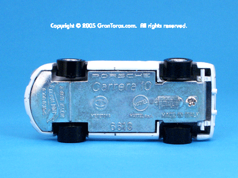 Bottom view of a yellow ochre hood white Gran Toros Porsche Carrera 10 showing logos and markings. |