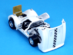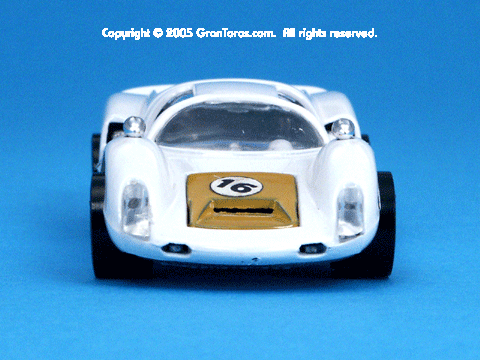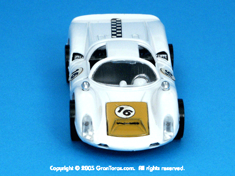Top front view of a white Gran Toros Porsche Carrera 10 with yellow ochre front hood. |