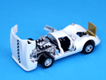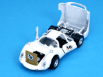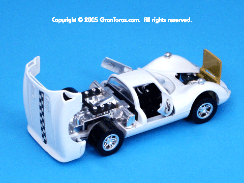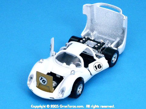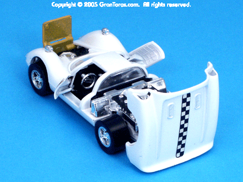 Top view of a yellow ochre hood white Gran Toros Porsche Carrera 10 with open engine compartment. |