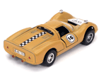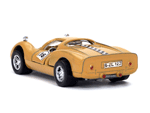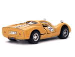 Top right rear quarter view of a yellow ochre Gran Toros Porsche Carrera 10 with white front hood. |