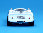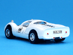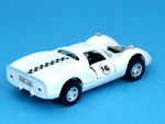 Top left front quarter view of a white Gran Toros Porsche Carrera 10 with metallic green front hood. |
