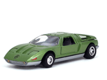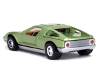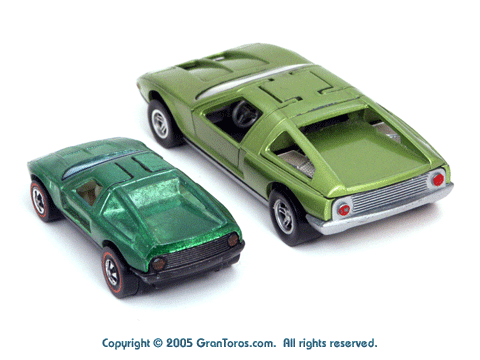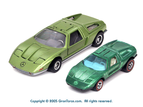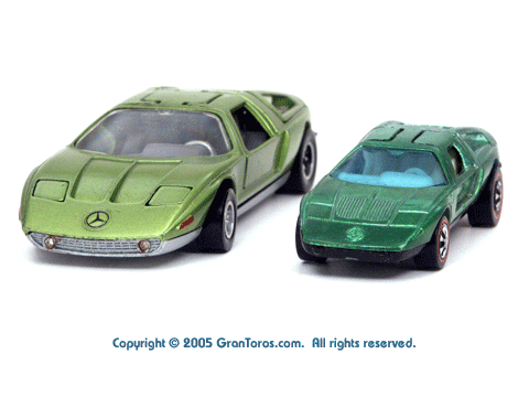 Top rear quarter view of a metallic green Gran Toros Mercedes C111 next to an original spectraflame green Hot Wheels (Redline) Mercedes C111. |
