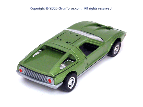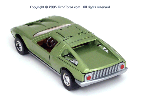 Rear quater view of the metallic green Gran Toros Mercedes C111. |