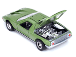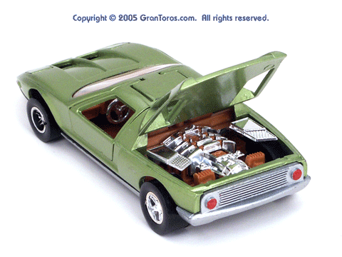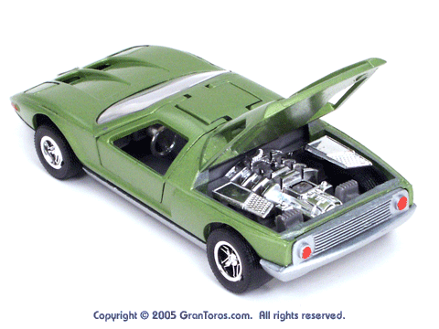Top left rear quater view of a metallic green Gran Toros Mercedes C111 (brown interior) with open engine compartment. |