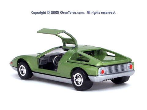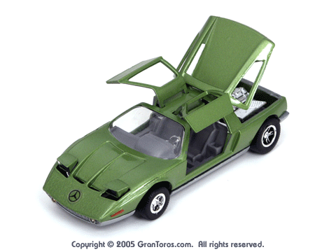 Rear quater view of a metallic green Gran Toros Mercedes C111 (grey interior) with open "gull wing" door. |