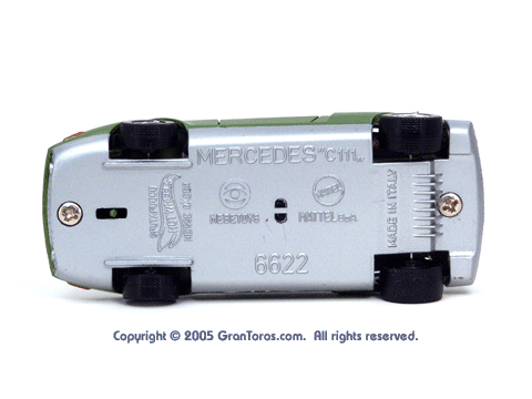 Bottom view of a green Gran Toros Mercedes C111 showing markings and headlight position switch / lever. |