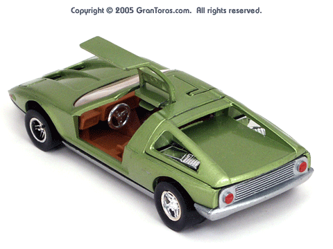 Top left rear quater view of a metallic green Gran Toros Mercedes C111 (brown interior) with open "gull wing" door. |