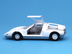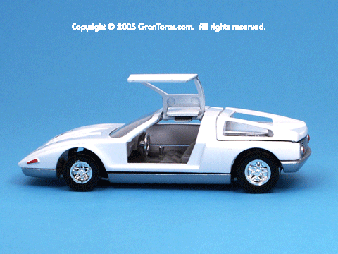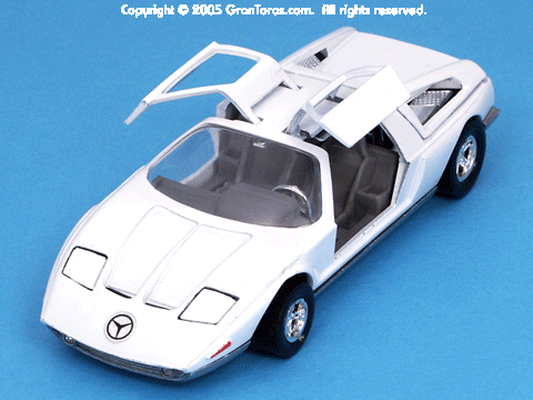 Left side view of a white Gran Toros Mercedes C111 (grey interior) with "gull wing" door open. |