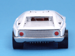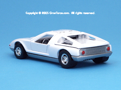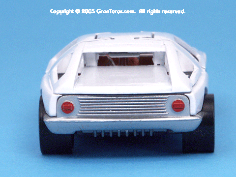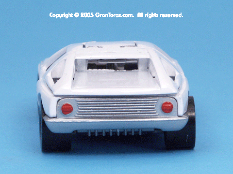 Rear view of a white Gran Toros Mercedes C111 (grey interior). |