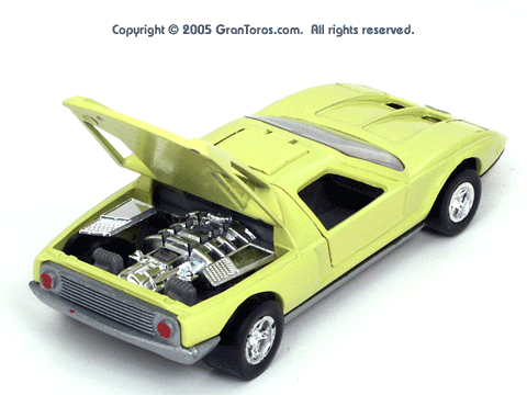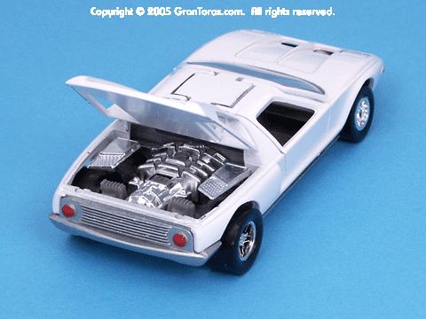 Top rear quater view of a metallic green Gran Toros Mercedes C111 (grey interior) with open engine compartment. |