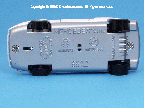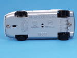 Bottom view of a white Gran Toros Mercedes C111 showing markings and headlight position switch / lever. |
