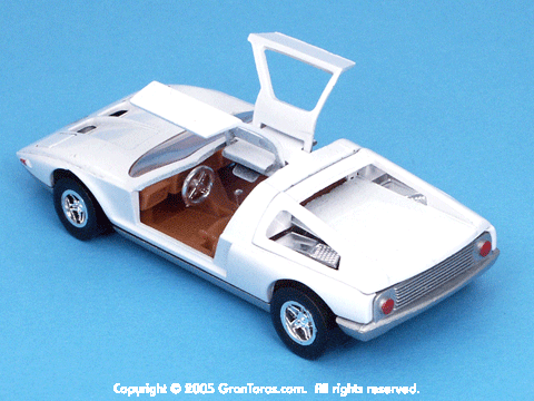 Rear view of a white Gran Toros Mercedes C111 (brown interior). |