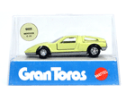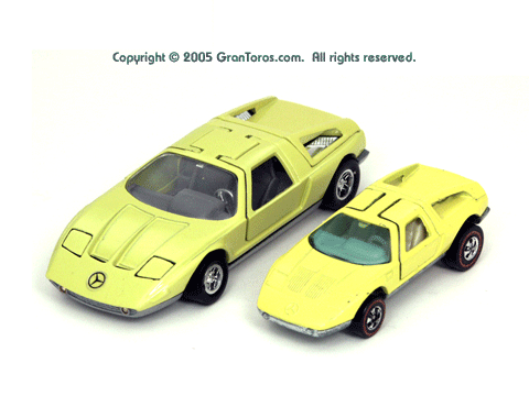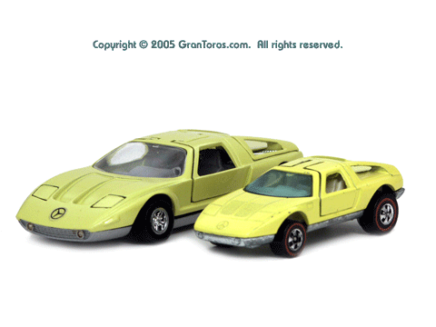 Left side view of a yellow Gran Toros Mercedes C111 next to an original 1973 yellow enamel Hot Wheels (Redline) Mercedes C111. |