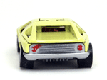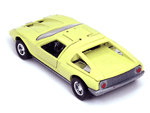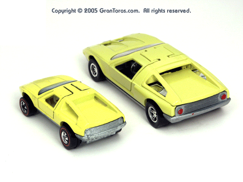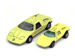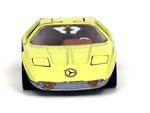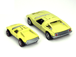 Top rear quarter view of a yellow Gran Toros Mercedes C111 next to an original 1973 yellow enamel Hot Wheels (Redline) Mercedes C111. |