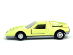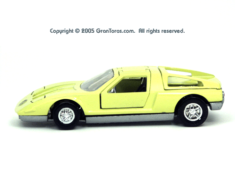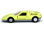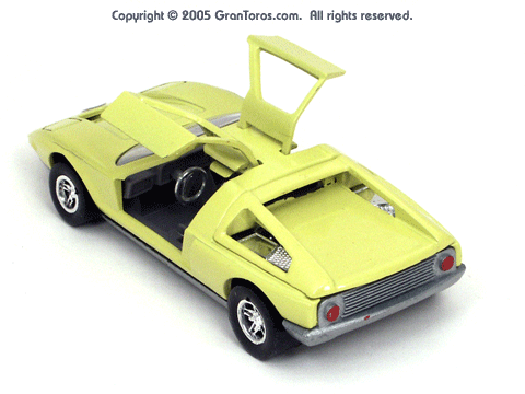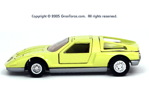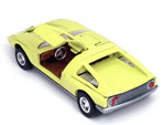 Top left rear quater view of a yellow Gran Toros Mercedes C111 (brown interior) with open "gull wing" door. |