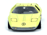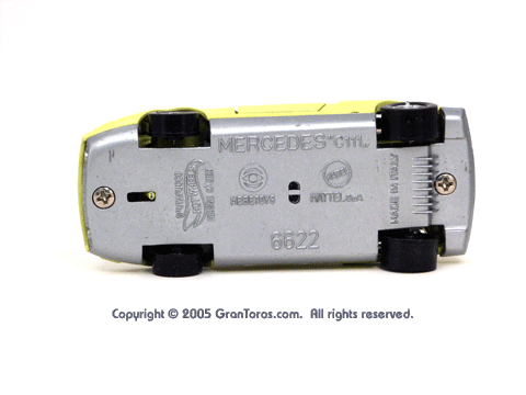 Bottom view of a yellow Gran Toros Mercedes C111 showing markings and headlight position switch / lever. |