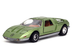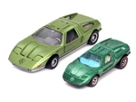 Front quarter view of a metallic green Gran Toros Mercedes C111 next to an original spectraflame green Hot Wheels (Redline) Mercedes C111. |