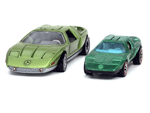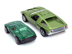 Top quarter view of a metallic green Gran Toros Mercedes C111 next to an original spectraflame green Hot Wheels (Redline)