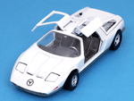 Top left rear quarter view of a white Gran Toros Mercedes C111 with "gull wing" doors open (brown interior). |