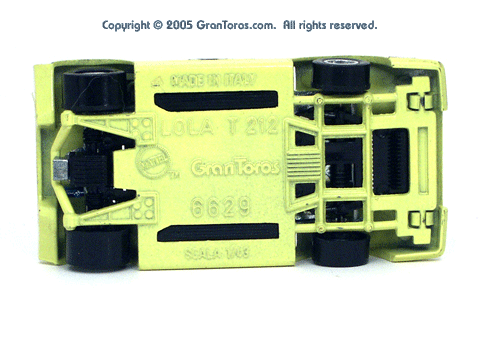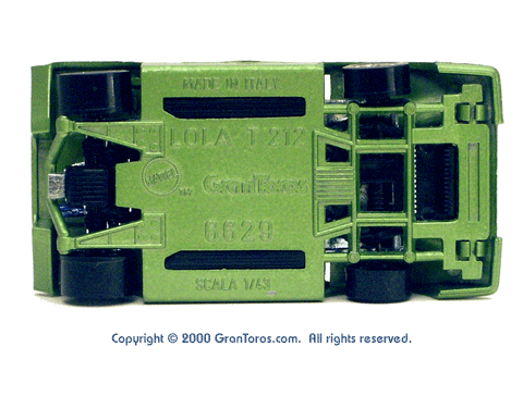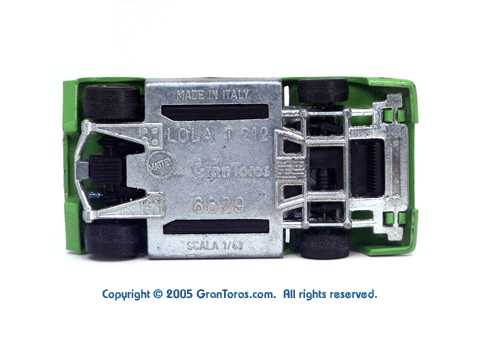 Bottom view of a very rare enamel green Gran Toros Lola T-212 showing the logos and markings. Note that the bottom of the model was not painted. |