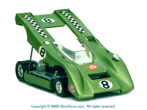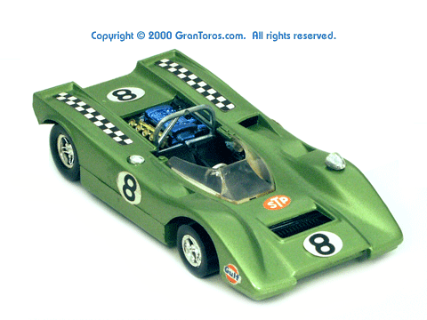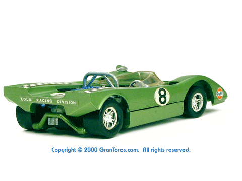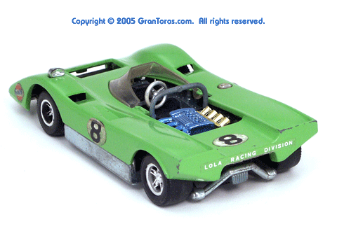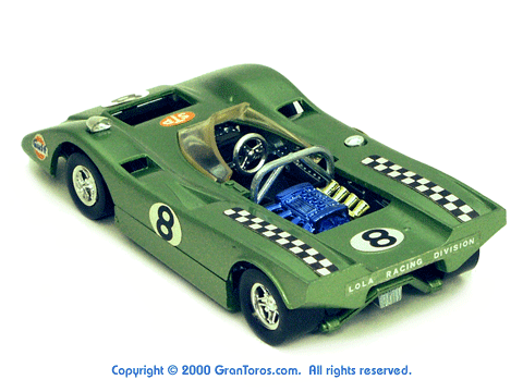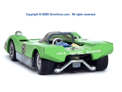 Right rear quater view of a metallic green Gran Toros Lola T-212. |