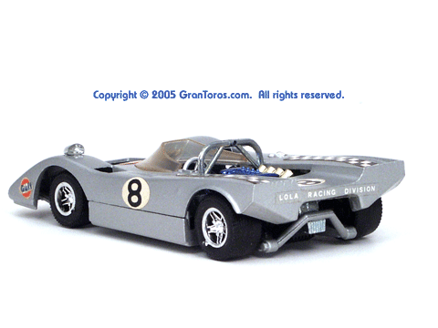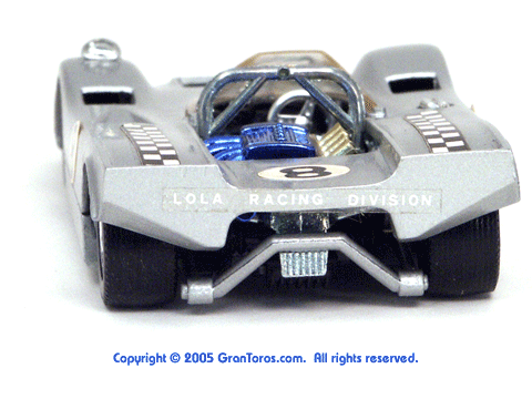 Top rear left quater view of a metallic silver Gran Toros Lola T-212. |