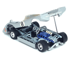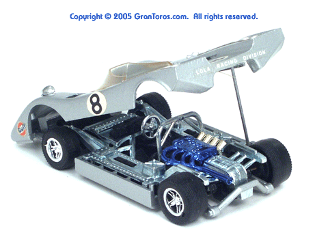 Top left rear quater view of a metallic silver Gran Toros Lola T-212 with the body lifted for servicing. |