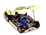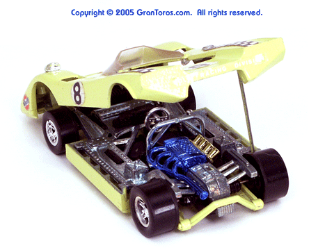 Right rear quater view of an enamel yellow Gran Toros Lola T-212 with the body lifted for servicing. |