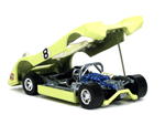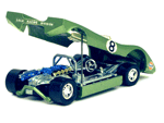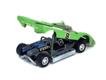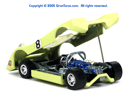 Right rear quater view of a very rare enamel green Gran Toros Lola T-212 with the body lifted for servicing. |