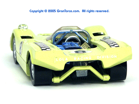 Top front right quater view of a very rare enamel green Gran Toros Lola T-212. |