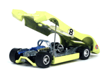 Top left rear quater view of an enamel yellow Gran Toros Lola T-212 with the body lifted for servicing. |