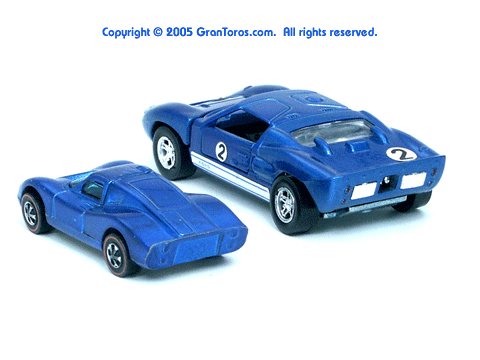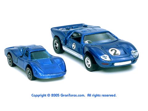 A blue Gran Toros Ford Mk II next to an original Hot Wheels Ford Mark IV (Redline). |