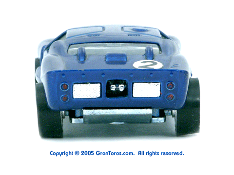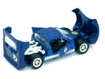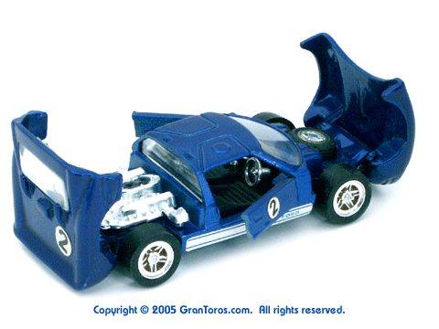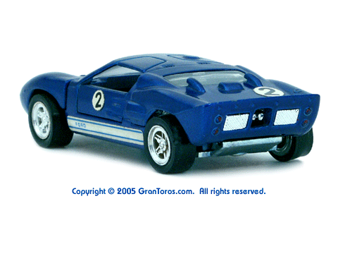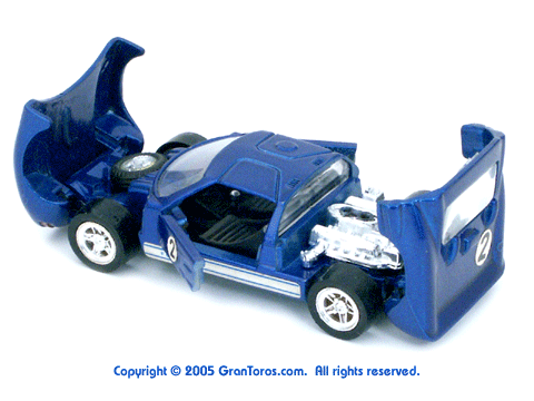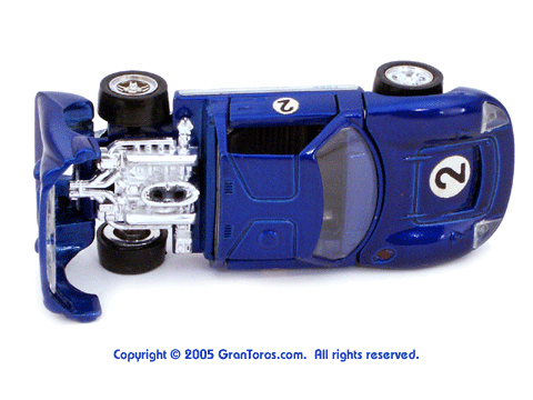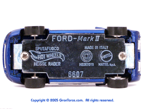 Bottom view of a blue Gran Toros Ford Mk II showing the logos and markings. |