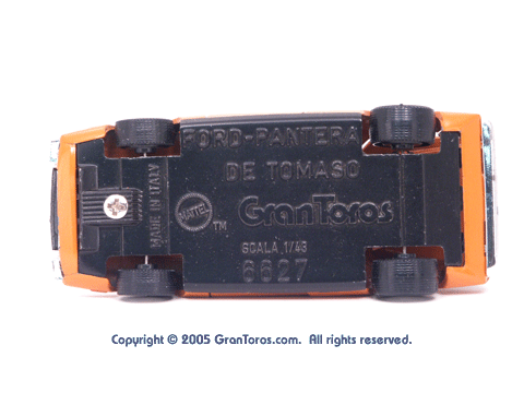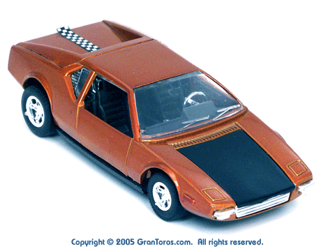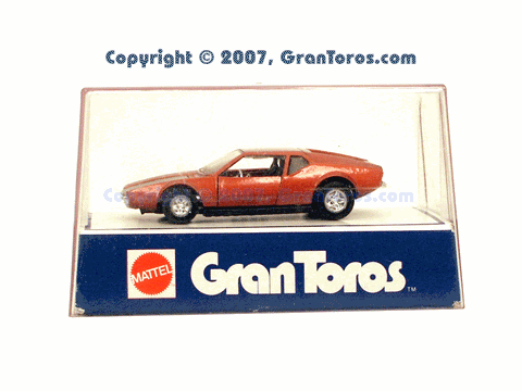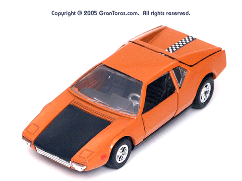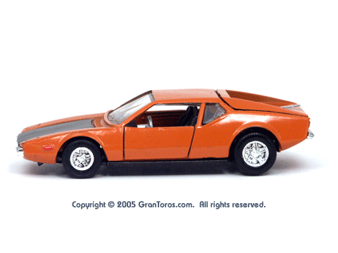 side view of an enamel orange Gran Toros Pantera DeTomaso. |