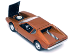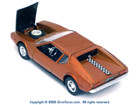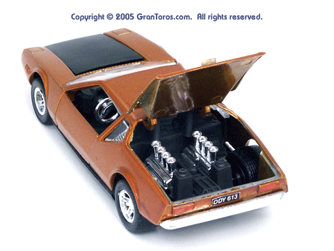 Top rear quater view of a metallic copper Gran Toros Pantera DeTomaso with open engine compartment. |