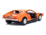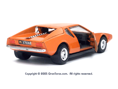 Rear quater view of an enamel orange Gran Toros Pantera DeTomaso with open door. |