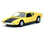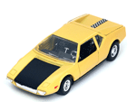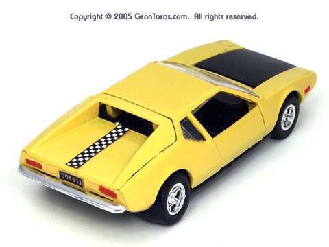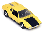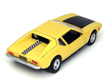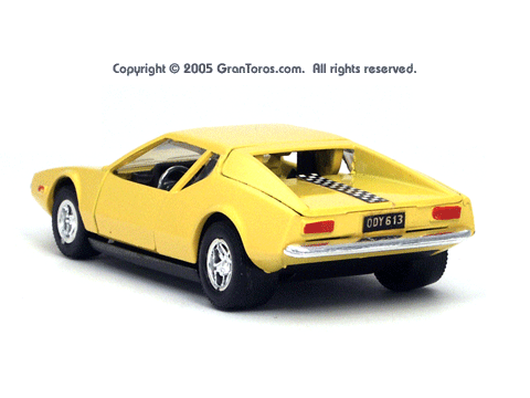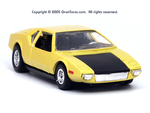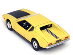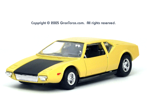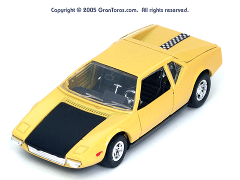 quater view of an enamel yellow Gran Toros Pantera DeTomaso. |