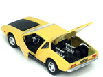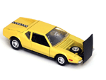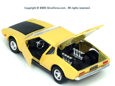Top rear quarter view of an enamel yellow Gran Toros Pantera DeTomaso with open door and engine compartment. |