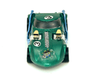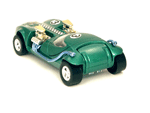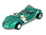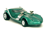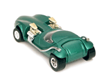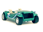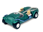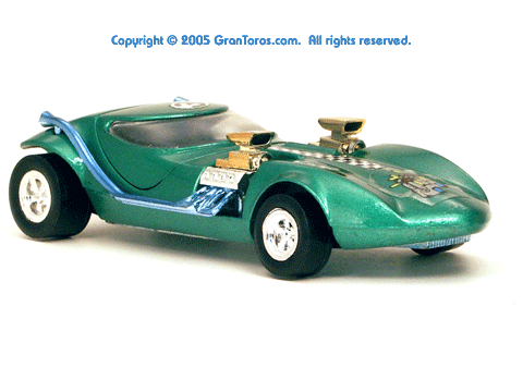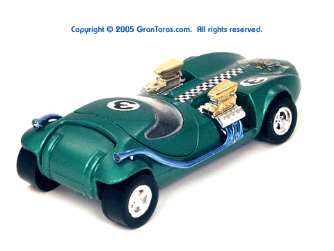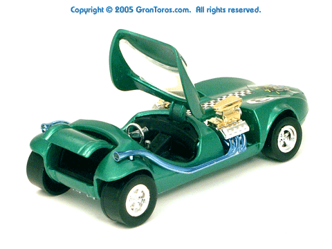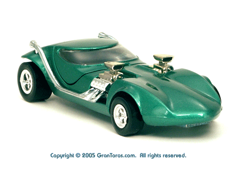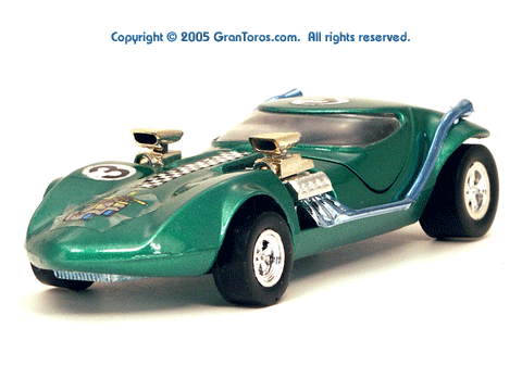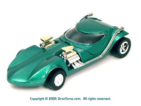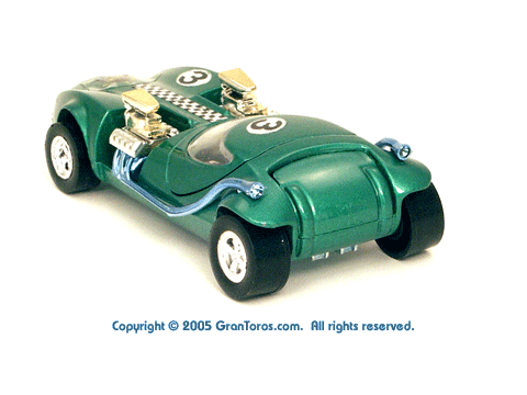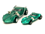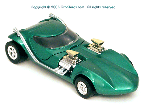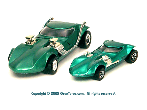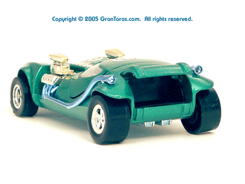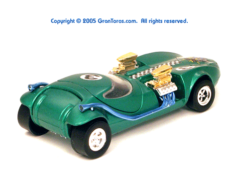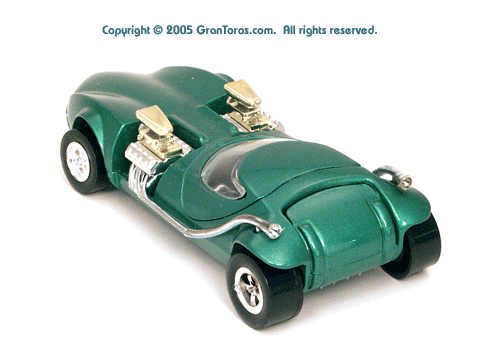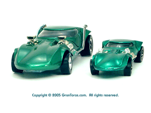 Right rear view of a green Gran Toros TwinMill next to an original Spectraflame Hot Wheels TwinMill ("Redline"). |