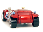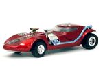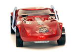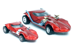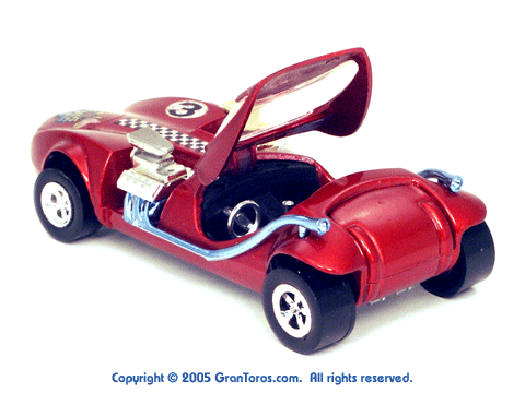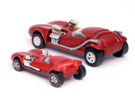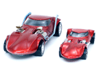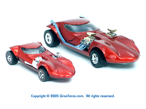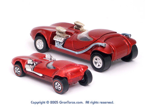 Rear quarter view of a red Gran Toros TwinMill next to an original Spectraflame rose Hot Wheels TwinMill ("Redline"). |